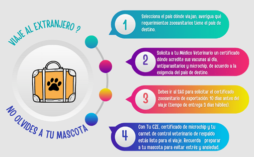 Para evitar inconvenientes a la hora de viajar, comencemos a revisar los pasos que debemos seguir: Lo primero que debes seleccionar es el país de destino, debido a que cada lugar del mundo tiene sus propias exigencias, en Chile el Servicio Agrícola y Ganadero (SAG) es el encargado en Chile de extender el Certificado Zoosanitario de Exportación (CZE) para que tu peludo viaje fuera del país. El certificado se puede solicitar de manera on-line o presencial, se demora alrededor de 3 días hábiles y debes solicitarlo 10 días antes del viaje https://www.sag.gob.cl/ambitos-de-accion/salida-de-mascotas-de-chile-perros-gatos-y-hurones en este sitio también, encontrarás toda la información necesaria detallada para el viaje, así cómo también las exigencias que tiene cada país para el ingreso de animales de compañía a su territorio.
