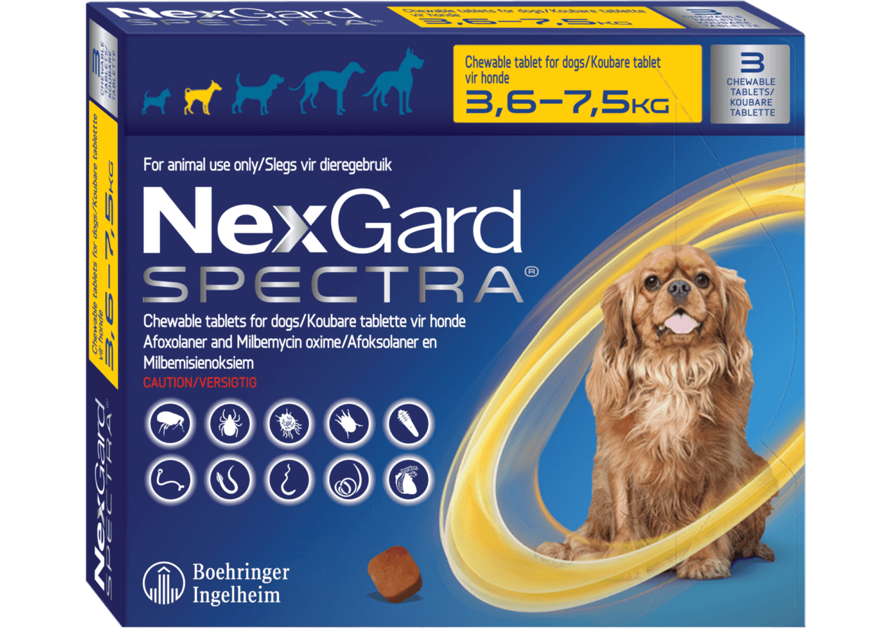 NexGard SPECTRA® 3,6-7,5 Kg es un antiparasitario masticable de amplio espectro que actúa sobre los principales ectoparásitos (pulgas y garrapatas) y los endoparásitos más frecuentes (vermes redondos, vermes gancho y vermes látigo). Indicado para perros de 3,6 a 7,5 Kg de peso. NexGard SPECTRA® proporciona bocados masticables altamente palatables con sabor a carne de ternera. Caja de 1 o 3 comprimidos. Consulte a su veterinario antes de administrar este antiparasitario a su perro.
